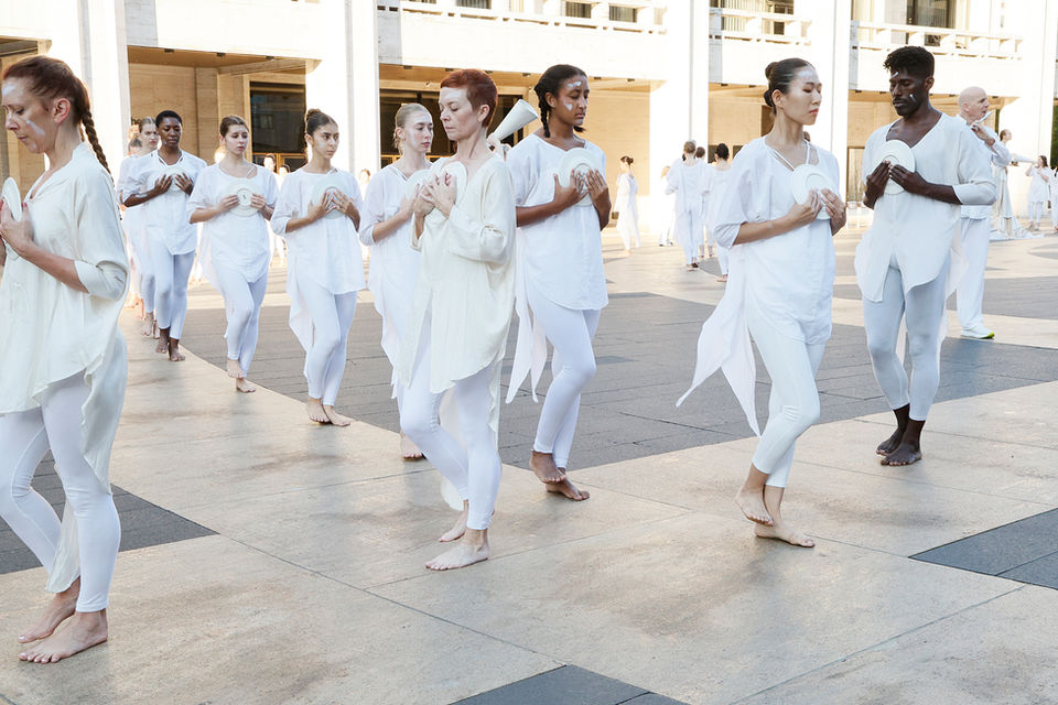 At first light, more than 150 dancers, draped in flowing diaphanous white, emerge onto the plaza to the ancient call of the conch shell. Hidden in the pocket of each dancer’s surplice is a handmade sacred sculpture plate created by Italian visual artist Rossella Vasta, personifying the banquet table that unites humanity. Through twelve ritualistic gestures, in repetitions of ten, the dancers form concentric circles around the Revson Fountain, whose water becomes a living symbol of purity and the continuity of the life cycle, to create a Peace Labyrinth. This sacred space is transformed by the transcendent energy of the living Mandala, linking dancers and viewers to the healing rituals of the natural world. The soundscape—the plaintive cries, the breath of the flute, the heartbeat of the drums connecting humanity—carries us toward a spiritual awakening at 8:46 a.m., when the dancers raise their arms skyward in a shared invocation of peace, transforming the universe from suffering to joy.